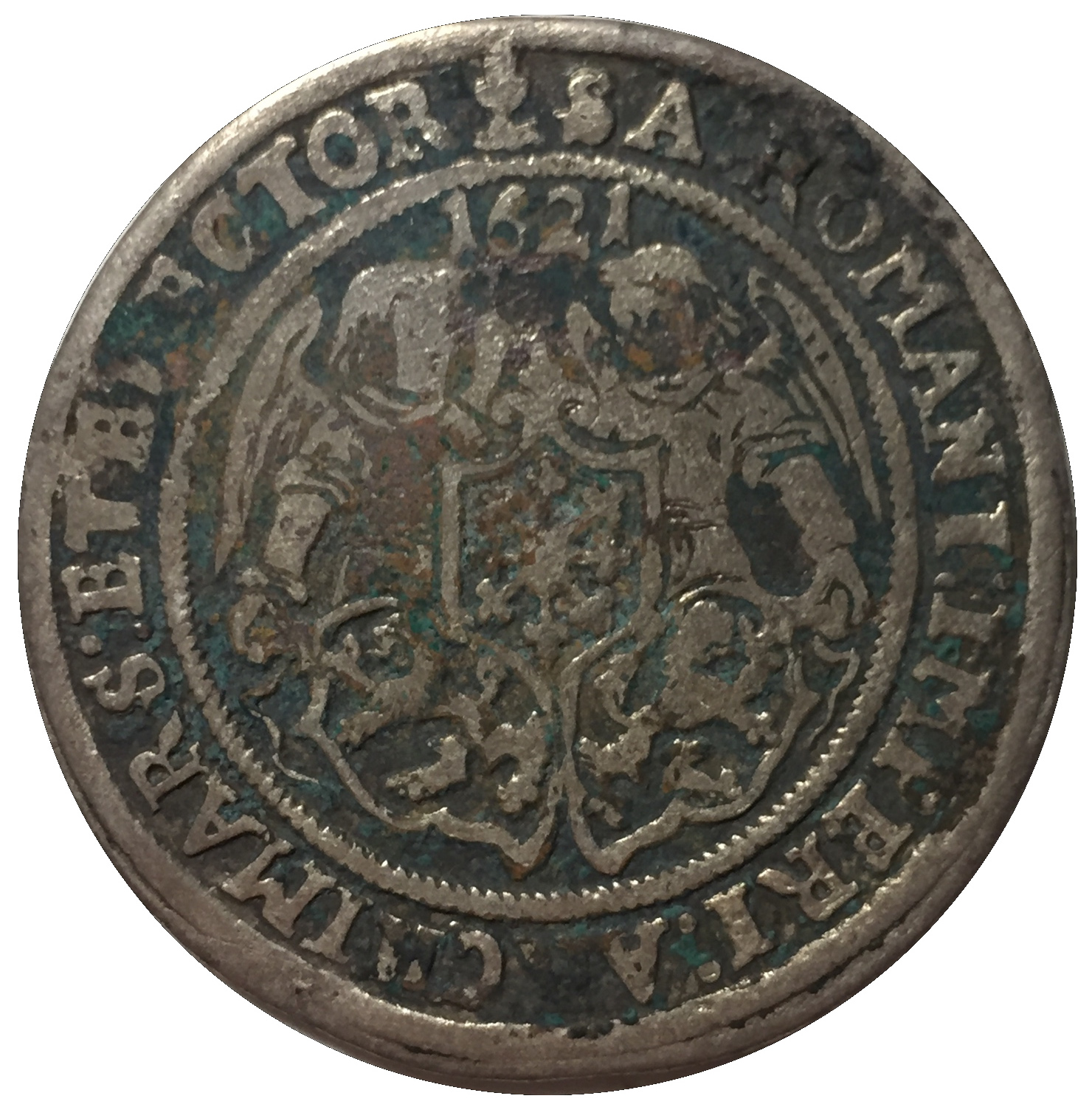 Опис: Два ангели за трьома гербами зі стрічками, рік зверху, напис навколо, знак монетного двору (жолудь з гілкою)