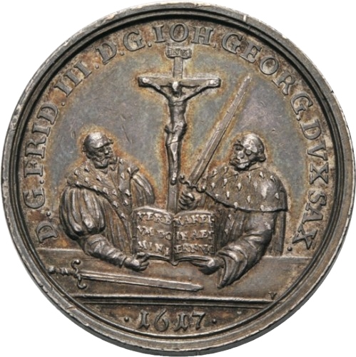 Опис: Фрідріх Мудрий та Йоганн Георг зі мечем стоять за столом і тримають книгу, між ними — хрест з Ісусом Христом.