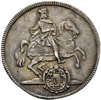 Опис: Фігура герцога верхи на коні праворуч, оздоблені герби в бароковій рамці знизу.