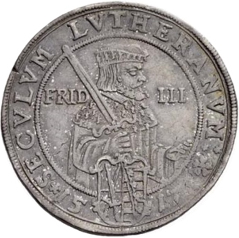 Опис: Напівфігура праворуч, одягнена в мантію та виборчий капелюх, тримає меч над правим плечем, розділяє FRID - III, щит з подвійними гербами виборчої та герцогської Саксонії спереду розділяє 15 - 17.