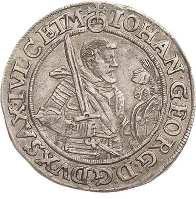Опис: Броньована фігура в правій половині монети з мечем над правим плечем, титули Йогана Георга I починаються з маленького імператорського яблука.