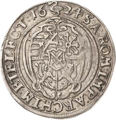 Опис: Прикрашені чотирикратні гербові щити з центральним щитом курфюрства Саксонія, дата розділена у верхньому полі символом монетного майстра, титули продовжуються.