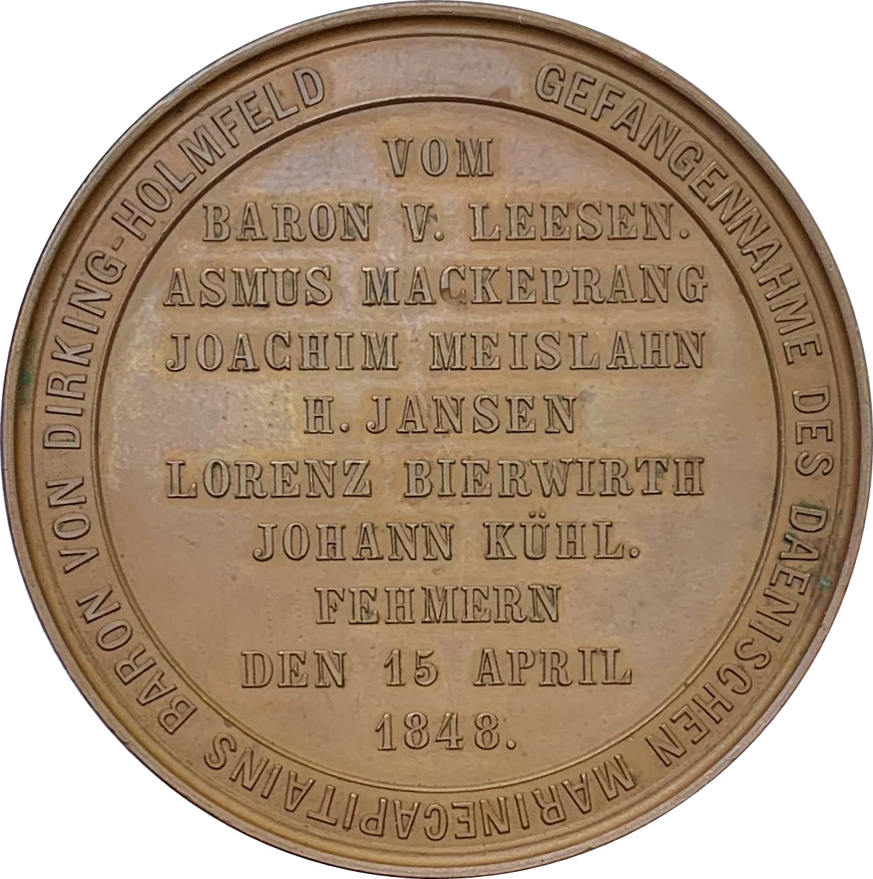 VOM // BARON V. LEESEN. // ASMUS MACKEPRANG // JOACHIM MEISLAHN // H. JANSEN // LORENZ BIERWIRTH // JOHANN KÜHL. // FEHMERN // DEN 15. APRIL // 1848.