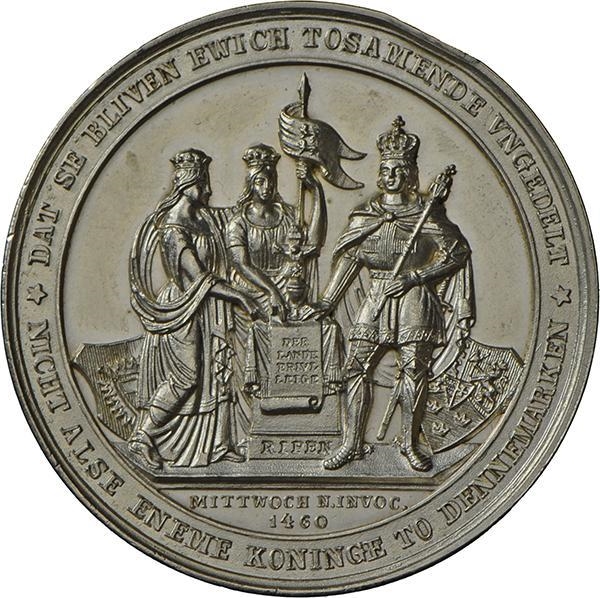 Опис: Крістіан I Ольденбурзький стоїть праворуч від вівтаря, проголошуючи національний закон у 1460 році. Він одягнений у королівське вбрання, тримає скіпетр, а біля його ніг лежить щит Данії. Ліворуч від нього стоять дві жінки у вуалях — уособлення Шлезвіга та Гольштейна (як свідчить щит за ними).