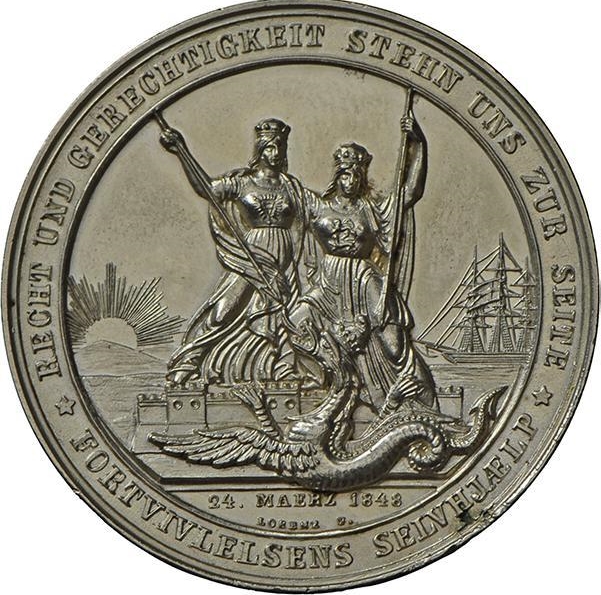 Опис: Персоніфікації Шлезвіга та Гольштейна стоять над укріпленнями, борючись проти нападників у вигляді ліндворма, на тлі східного сонця та корабля.