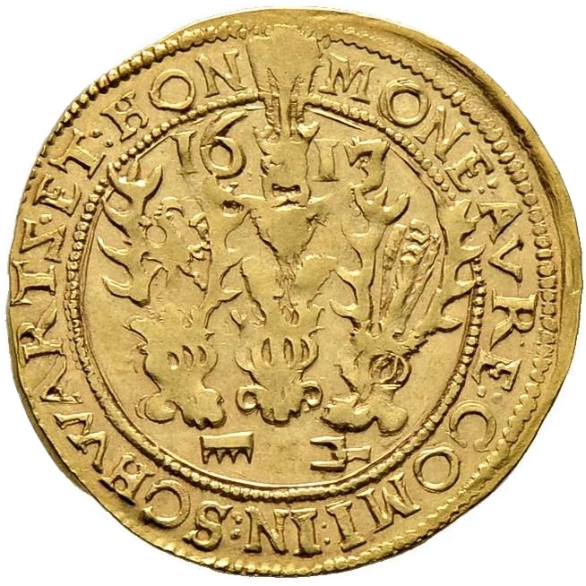 1 золотий гульден — Карл Гюнтер, Луї Гюнтер, Альберт Гюнтер, Гюнтер XLII, Ентоні Генрі, Джон Гюнтер II та Крістіан Гюнтер 1611 – 1618 Шварцбург, графство