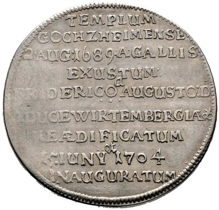 TEMPLUM / GOCHZHEIMENSI / 2:AUG:1689.A.GALLIS / EXUSTUM: / A / FRIDERICO AUGUSTO:D / A DUCE WIRTEMBERGIAE / REAEDIFICATUM / 15.IUNY 1704 / INAUGURATUM