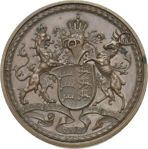 Опис: Герб з короною та шоломом, з левом та оленем як опорами.