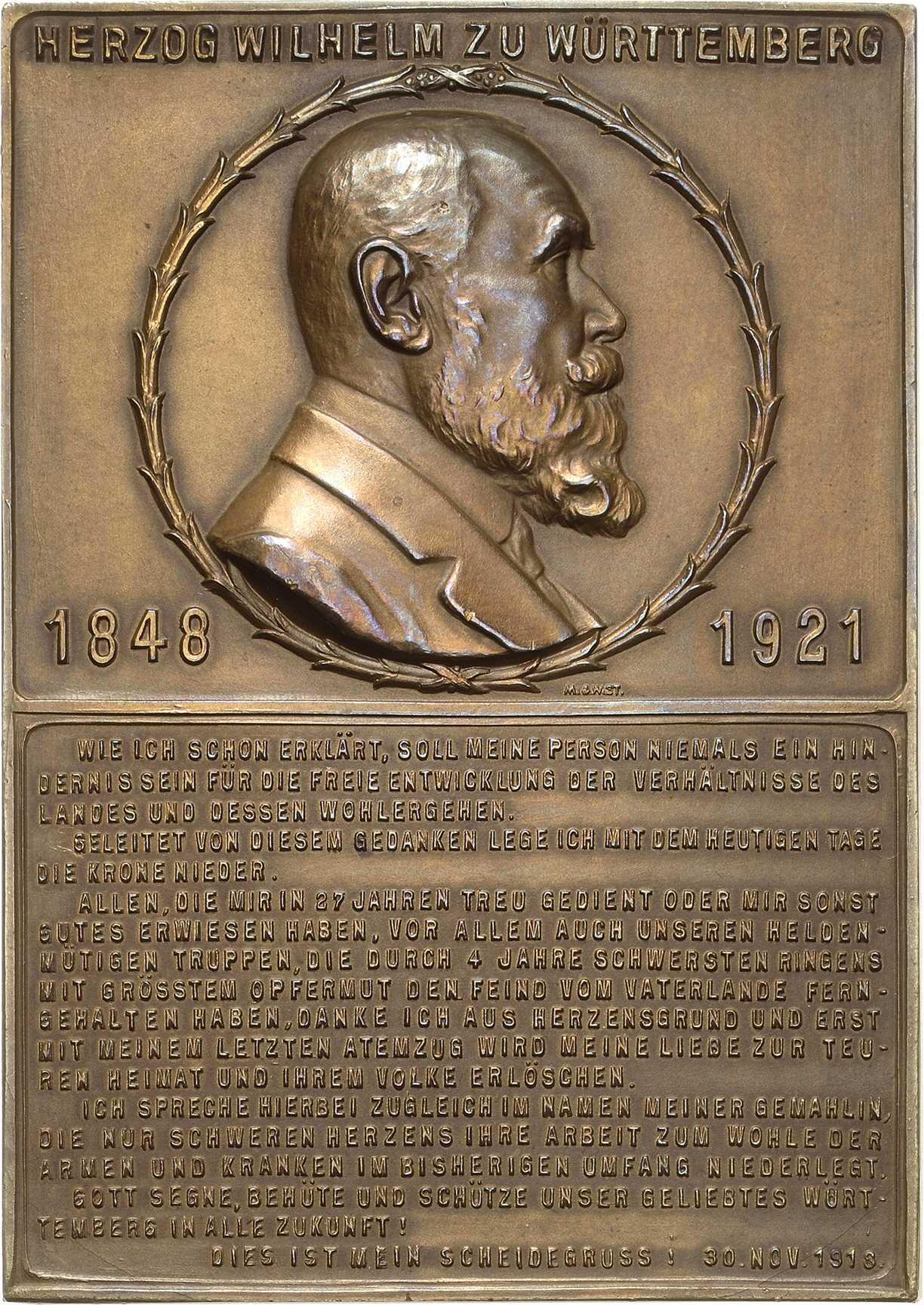 WIE ICH SCHON ERKLÄRT, SOLL MEINE PERSON NIEMALS EIN HINDERNIS SEIN FÜR DIE FREIE ENTWICKLUNG DER VERHÄLTNISSE DES LANDES UND DESSEN WOHLERGEHEN. GELEITET VON DIESEM GEDANKEN LEGE ICH MIT DEM HEUTIGEN TAGE DIE KRONE NIEDER. ALLEN, DIE MIR IN 27 JAHREN TREU GEDIENT ODER MIR SONST GUTES ERWIESEN HABEN, VOR ALLEM AUCH UNSEREN HELDENMÜTIGEN TRUPPEN, DIE DURCH 4 JAHRE SCHWERSTEN RINGENS MIT GRÖSSTEM OPFERMUT DEN FEIND VOM VATERLAND FERNGEHALTEN HABEN, DANKE ICH AUS HERZENSGRUND UND ERST MIT MEINEM LETZTEN ATEMZUGWIRD MEINE LIEBE ZUR TEUREN HEIMAT UND IHREM VOLKE ERLÖSCHEN. ICH SPRECHE HIERBEI ZUGLEICH IM NAMEN MEINER GEMAHLIN, DIE NUR SCHWEREN HERZENS IHRE ARBEITZUM WOHLE DER ARMEN UND KRANKEN IM BISHERIGEN UMFANG NIEDERLEGT. GOTT SEGNE, BEHÜTE UND SCHÜTZE UNSER GELIEBTES WÜRTTEMBERG IN ALLE ZUKUNFT!