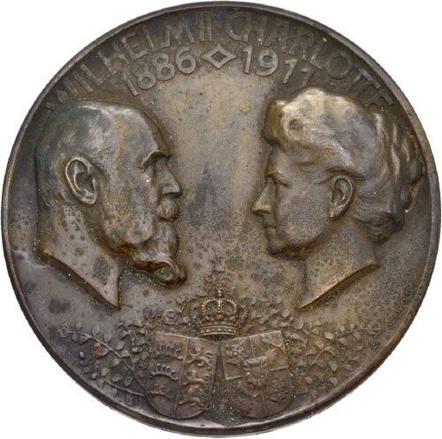 Опис: Портрети короля Вільгельма II та королеви Шарлотти, що дивляться один на одного, під двома коронованими гербами між гілками.