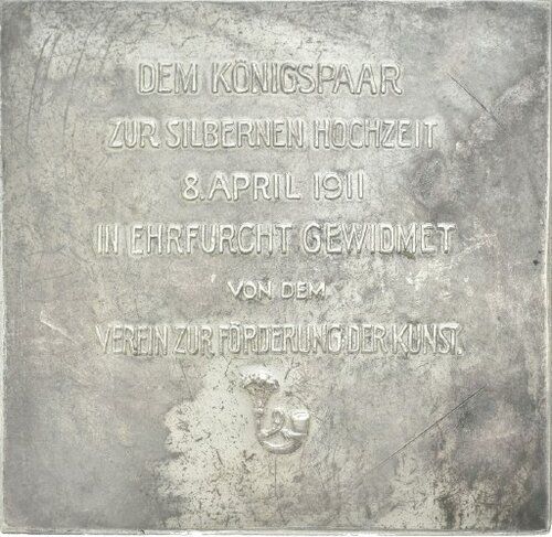 DEM KÖNIGSPAAR / ZUR SILBERNEN HOCHZEIT / 8. APRIL 1911 / IN EHRFURCHT GEWIDMET / VON DEM / VEREIN ZUR FÖRDERUNG DER KUNST.