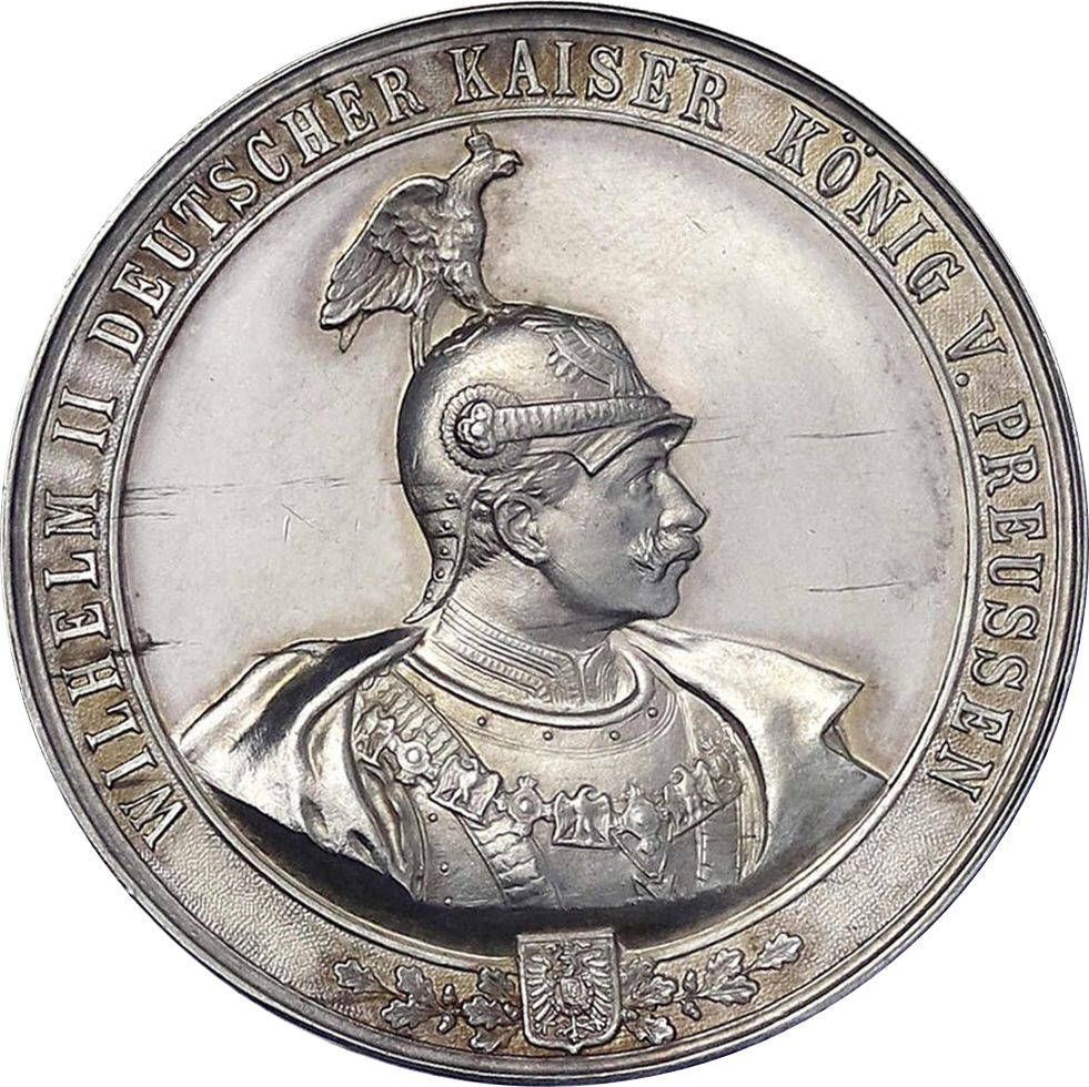 Опис: Бюст Вільгельма II в шоломі та обладунках, звернений вправо, щит з імператорським орлом над дубовими гілками внизу.