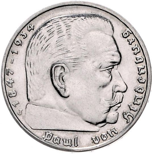 Опис: Портрет Пауля фон Гінденбурга (1847–1934), німецького військового і політика, президента Рейху з 1925 року до своєї смерті, звернений праворуч, а знак монетного двору розташований за портретом під датою.
