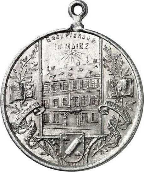 Опис: Молодий чоловік, який покладає вінок до стовпа — пам'ятника з бюстом Гутенберга, з обох боків лаврові рослини, праворуч чаша з полум'ям, позаду парапет з гербом міста Майнцського собору.