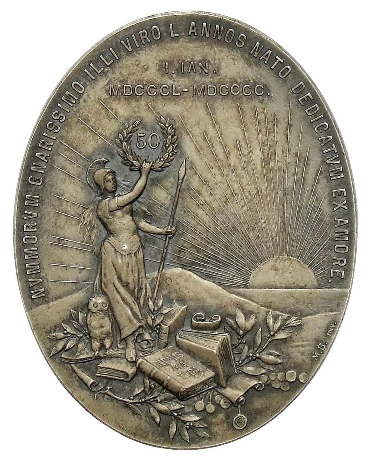 NVMMORVM GNARISSIMO ILLI VIRO L. ANNOS NATO DEDICATVM EX AMORE. -/ I. IAN. / MDCCCL - MDCCCC