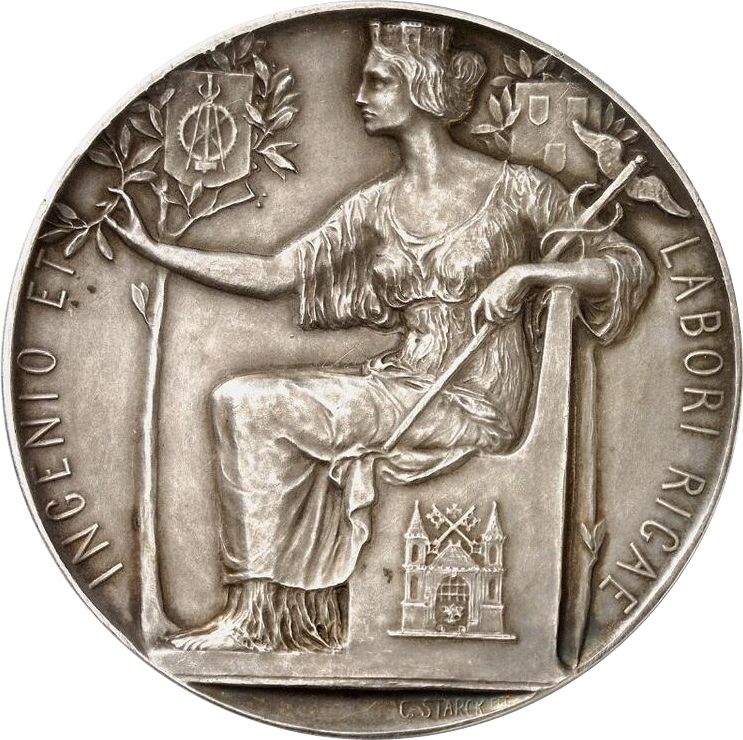 Опис: Жіноча фігура з баштою (алегоричне уособлення Риги) сидить на троні ліворуч, тримаючи в лівій руці кадуцей, а в правій — гілку лаврового дерева з інструментами на верхівці та гербом міста на троні, праворуч — ще одне лаврове дерево, також з гербом на верхівці.