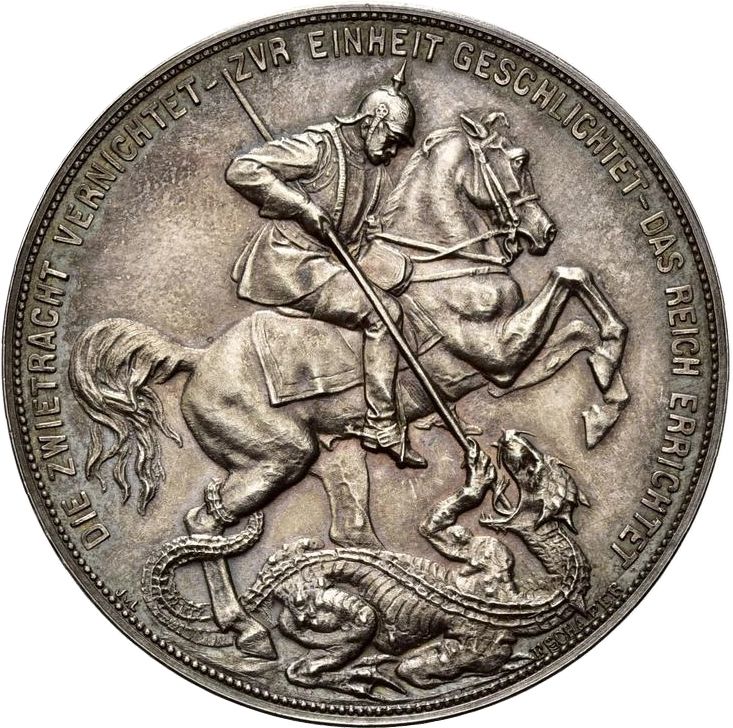 Опис: Бісмарк на коні праворуч у обладунках і шоломі, що вбиває ліндурма списом.
