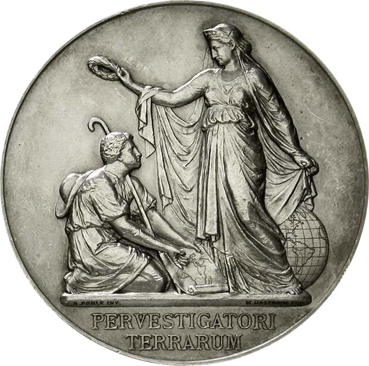 Опис: Жіноча фігура в довгій сукні праворуч вітає молодого чоловіка, який стоїть на колінах перед нею з палицею та подорожнім капелюхом на спині, який вказує на карту в своїх руках, за жіночою фігурою — глобус.