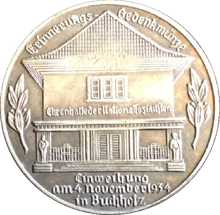 Опис: На зворотному боці монети зображено двоповерховий будинок. По обидва боки будівлі розміщено лаврові гілки. У нижній частині будівлі написано «Einweihung am 4. November 1934 in Buchholz» (Відкриття 4 листопада 1934 року в Бухгольці).