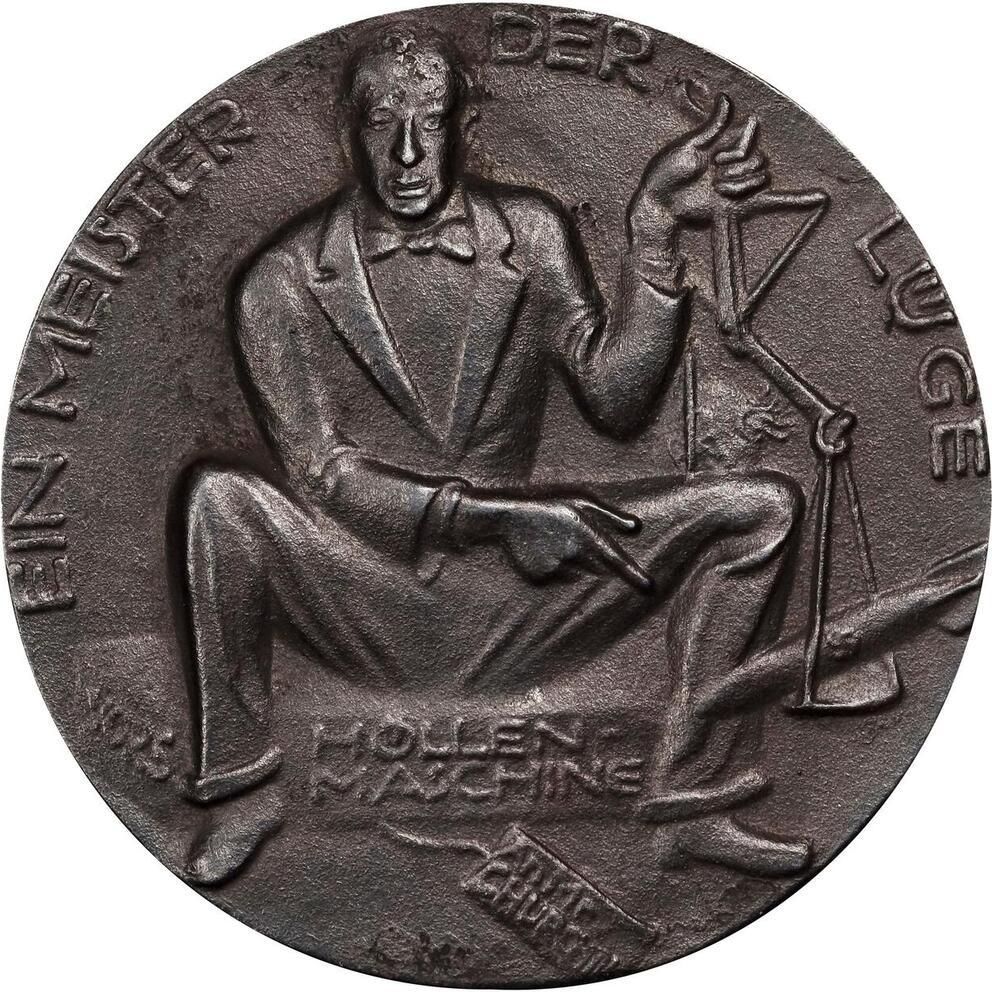 Опис: Британський прем'єр-міністр сер Вінстон Черчилль тримає в руках нерівні ваги з двома бомбами, одна з яких прикрашена прапором Великої Британії, а інша — свастикою, сидячи на п'єдесталі.