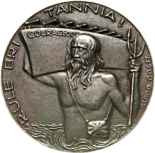 Опис: Напівфігура Нептуна, одягненого в рюкзак, прикрашений прапором Великої Британії, що стоїть трохи ліворуч в океані, підтримуючи корпус корабля, а над ним літак, на плечі, і тризуб.