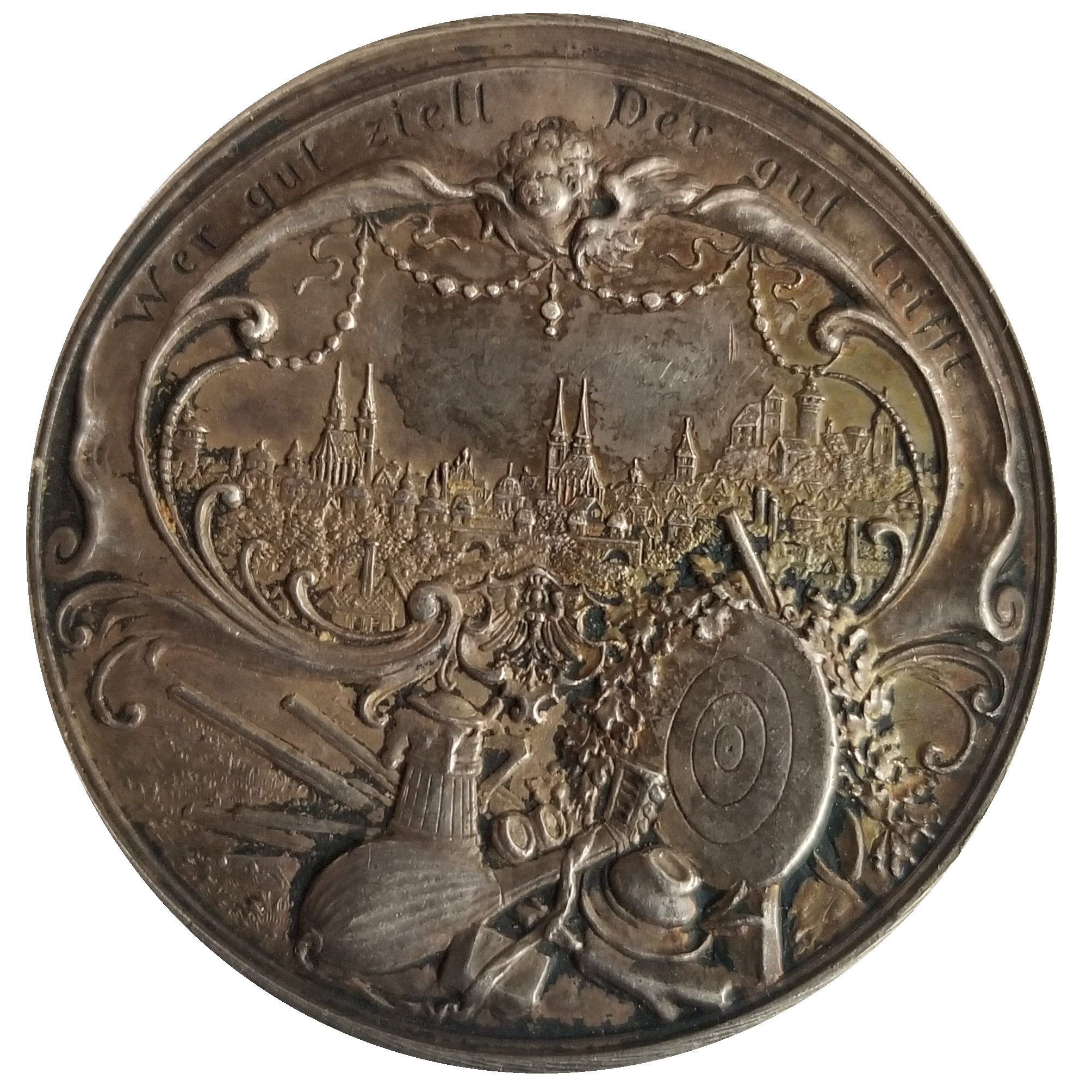 Опис: Голова Купідона над видом міста Нюрнберга в картуші з гербом у центрі, нижче — предмети, пов'язані зі стрілецькими фестивалями: рушниця, мішень, капелюх, пивний кухоль, бінокль.