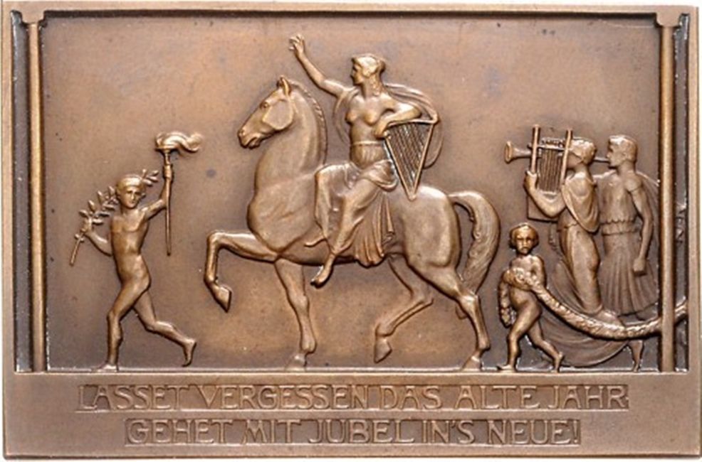 Опис: Жіноча фігура з арфою верхи на коні, що їде ліворуч, ліворуч — оголена чоловіча фігура з факелом і лавровою гілкою, праворуч — дві чоловічі фігури з музичними інструментами та херувим, що тримає гірлянду.