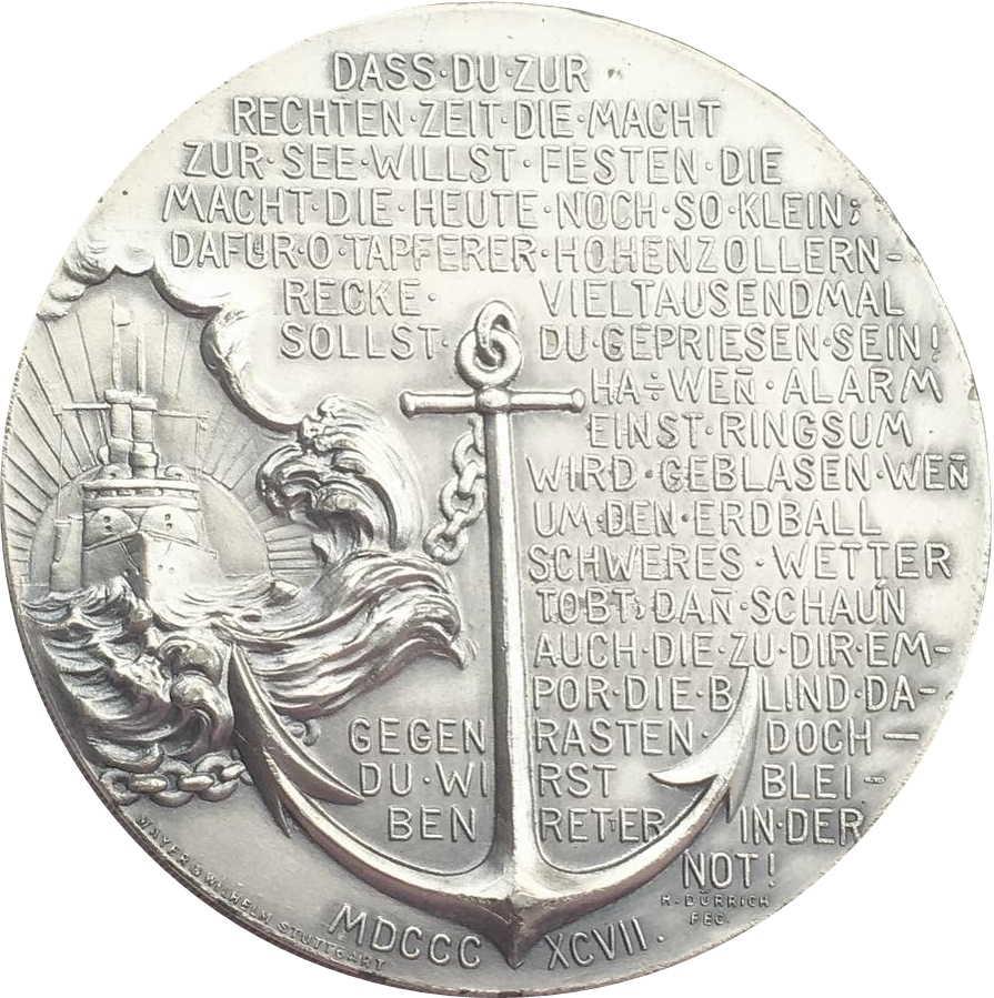 DASS.DU.ZUR // RECHTEN.ZEIT.DIE.MACHT // ZUR.SEE.WILLST.FESTEN.DIE // MACHT.DIE.HEUTE.NOCH.SO.KLEIN; // DAFUR.O.TAPFERER.HOHENZOLLERN- // RECKE. VIELTAUSENDMAL // SOLLST. DU.GEPRIESEN.SEIN! //HA:WEN.ALARM // EINST.RINGSUM // WIRD.GEBLASEN.WEN // UM.DEN.ERDBALL // SCHWERES.WETTER // TOBT;DAN.SCHAUN // AUCH.DIE.ZU.DIR.EM- // POR.DIE.B LIND.DA- // GEGEN RASTEN. DOCH- // DU.WI RST BLEI- // BEN RETTER IN.DER // NOT!