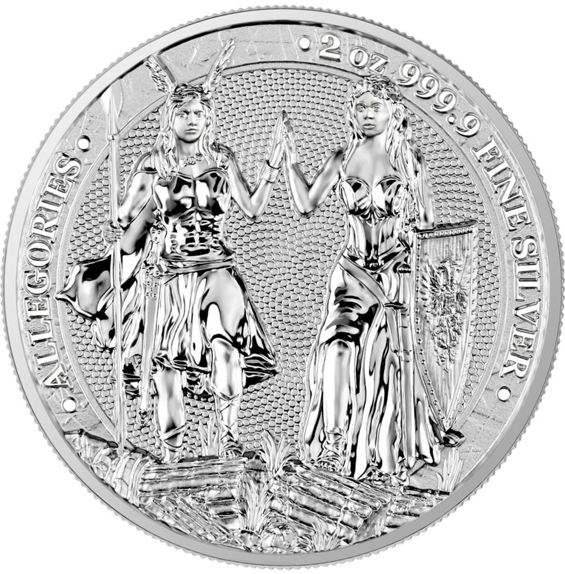 Опис: Персоніфікація Галлії зображена у вигляді молодої жінки з короною з крилами на голові, яка тримає спис. Персоніфікація Германії гордо стоїть поруч із Галлією зі щитом у руках, що свідчить про рівність і позитивні відносини між народами. На аверсі розміщено напис «ALLEGORIES» та інформацію про вагу і пробу металу.