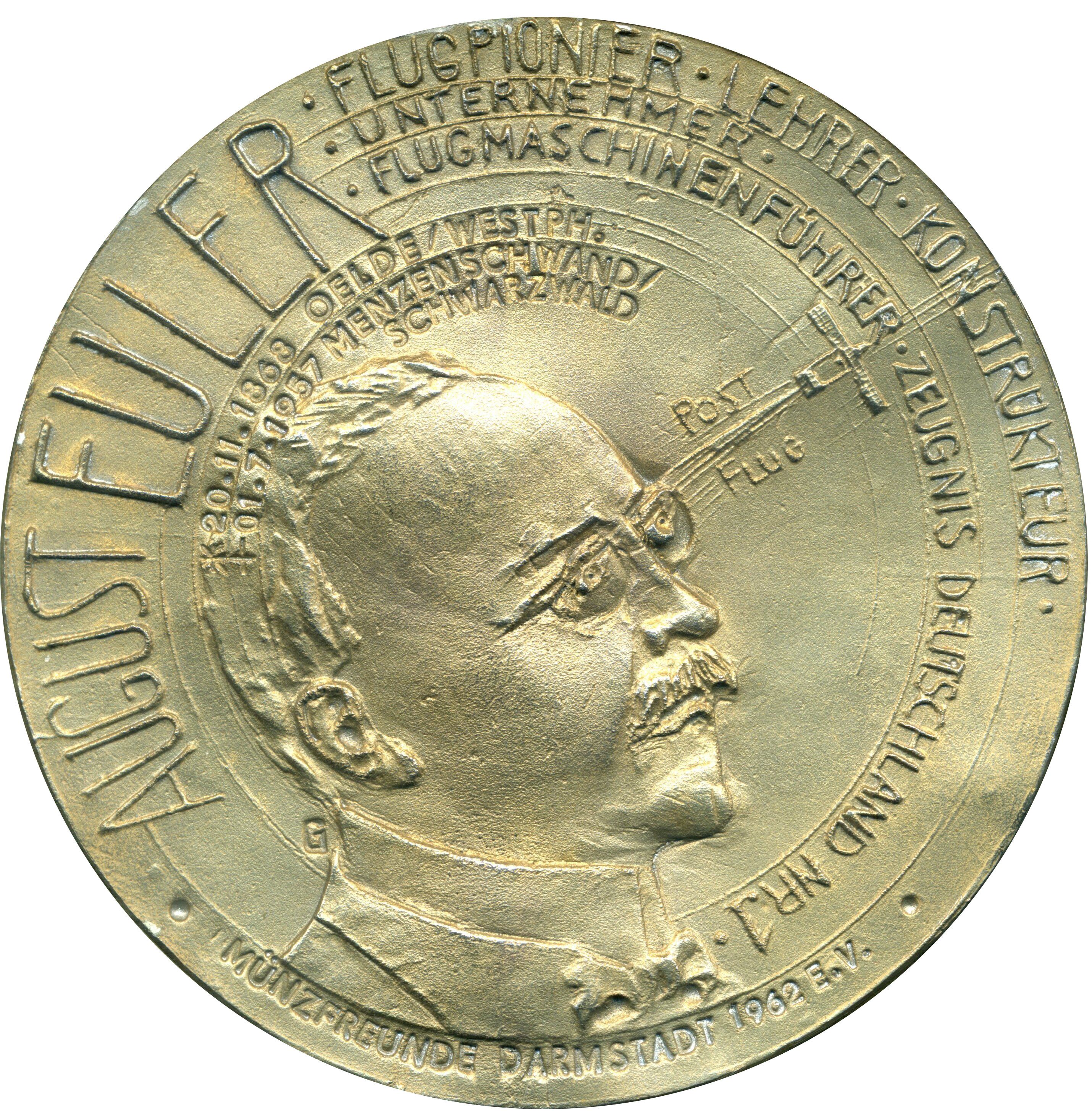 Опис: Перекладено з сертифіката: У центрі зображено бюст Августа Ейлера, його погляд спрямований вгору, він бачить літальний апарат «Жовтий пес» у зв'язку з POST FLUG. Дані про його життя розташовані сегментами кола. У полі — підпис художника G Оригінальний німецький текст: Im Zentrum die Büste von August Euler, seinen Blick visionär nach oben gerichtet, die Flugmaschine «Gelber hund» in Verbindung mit POST FLUG sehend. In Kreissegmenten angeordnet seine Lebensdaten. Im Feld die Künstlersignatur G