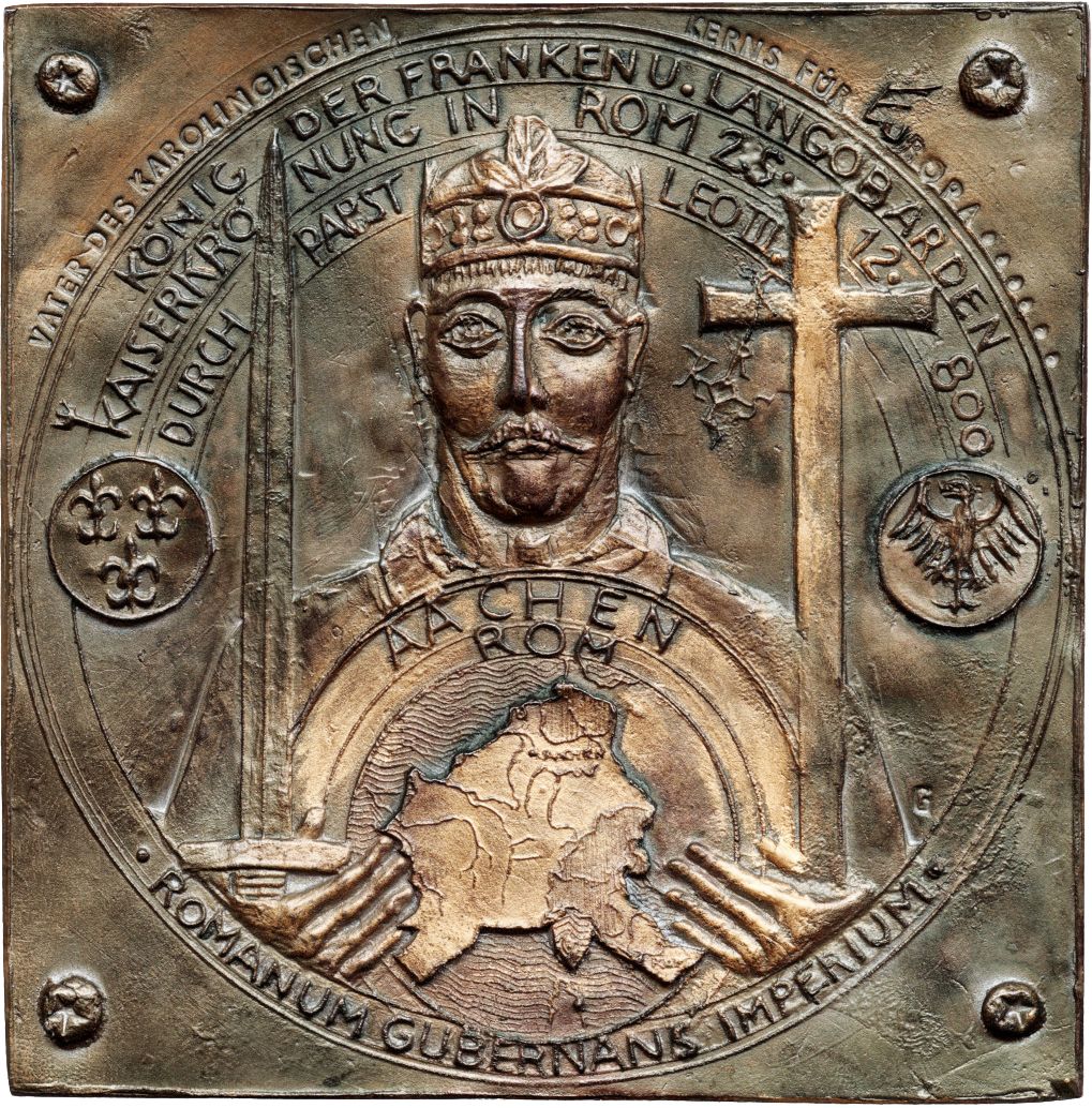 Опис: Портрет Карла Великого в короні, зображений спереду, з мечем і хрестом (з прикріпленим знаком Карла Великого), медаль зліва з французькою лілією і праворуч з німецьким орлом. Перед грудьми — карта Каролінгської імперії з позначками Аахена і Рима.