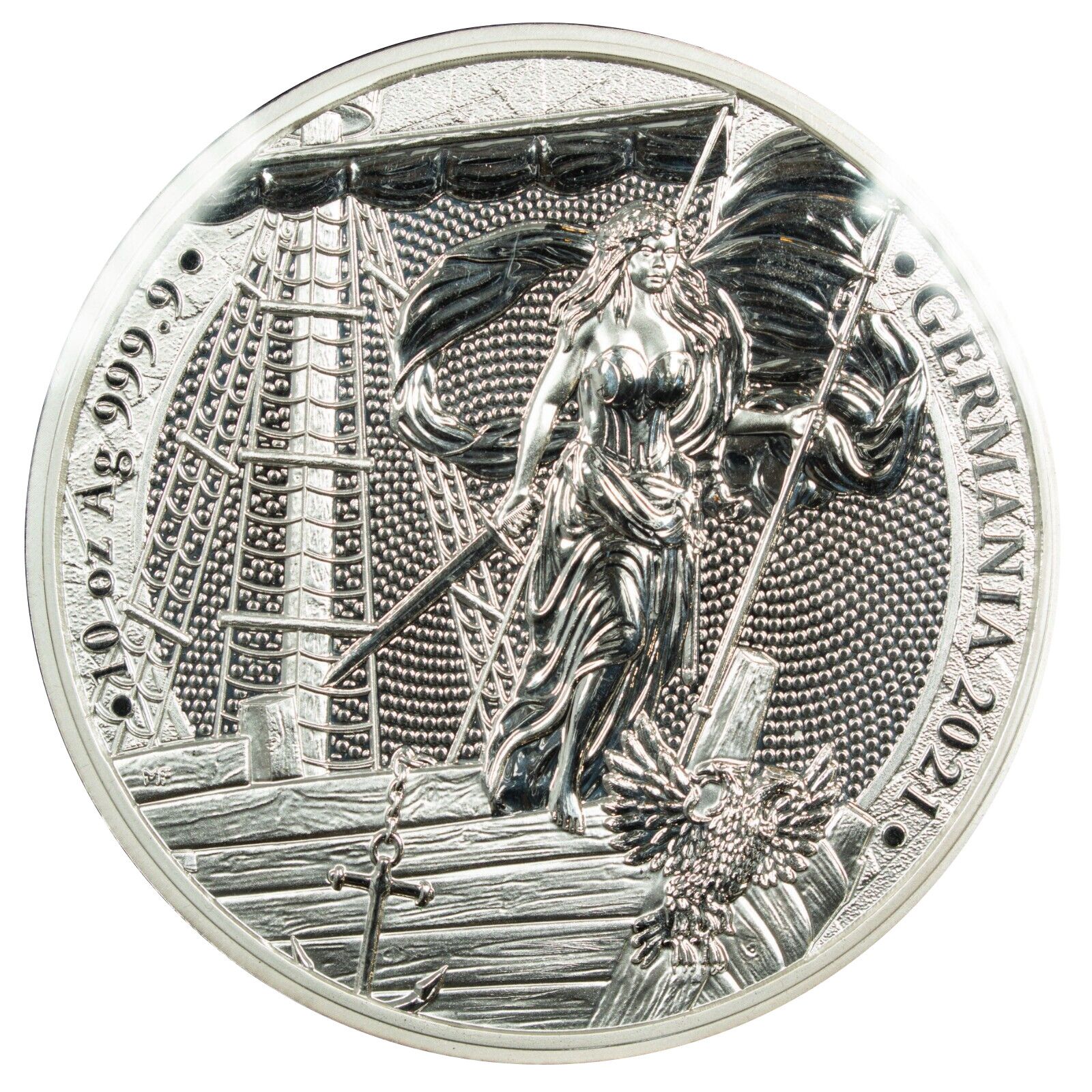 Опис: На аверсі срібних монет Germania 2021 року зображено абсолютно нове зображення жіночої алегорії. Ведучи свій народ і монетний двір у нову еру, Germania стоїть на носі корабля, готова до того, що чекає попереду. Вона зображена з традиційними символами, серед яких її бойова броня та лавровий вінок. У правій руці вона тримає Reichsschwert, а в лівій — прапор на жердині. На носі корабля ви також помітите двоголового орла монетного двору Germania.