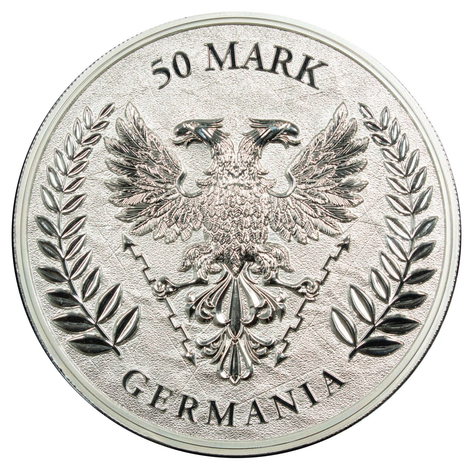 Опис: На зворотному боці срібної монети Germania 2021 року номіналом 10 унцій зображено печатку монетного двору Germania. Цей дизайн використовується в різних програмах монетного двору Germania і базується на зображенні двоголового орла. Двоголовий орел — популярний геральдичний символ, який з'являвся в символіці держав та імперій від античності до початку 20 століття.