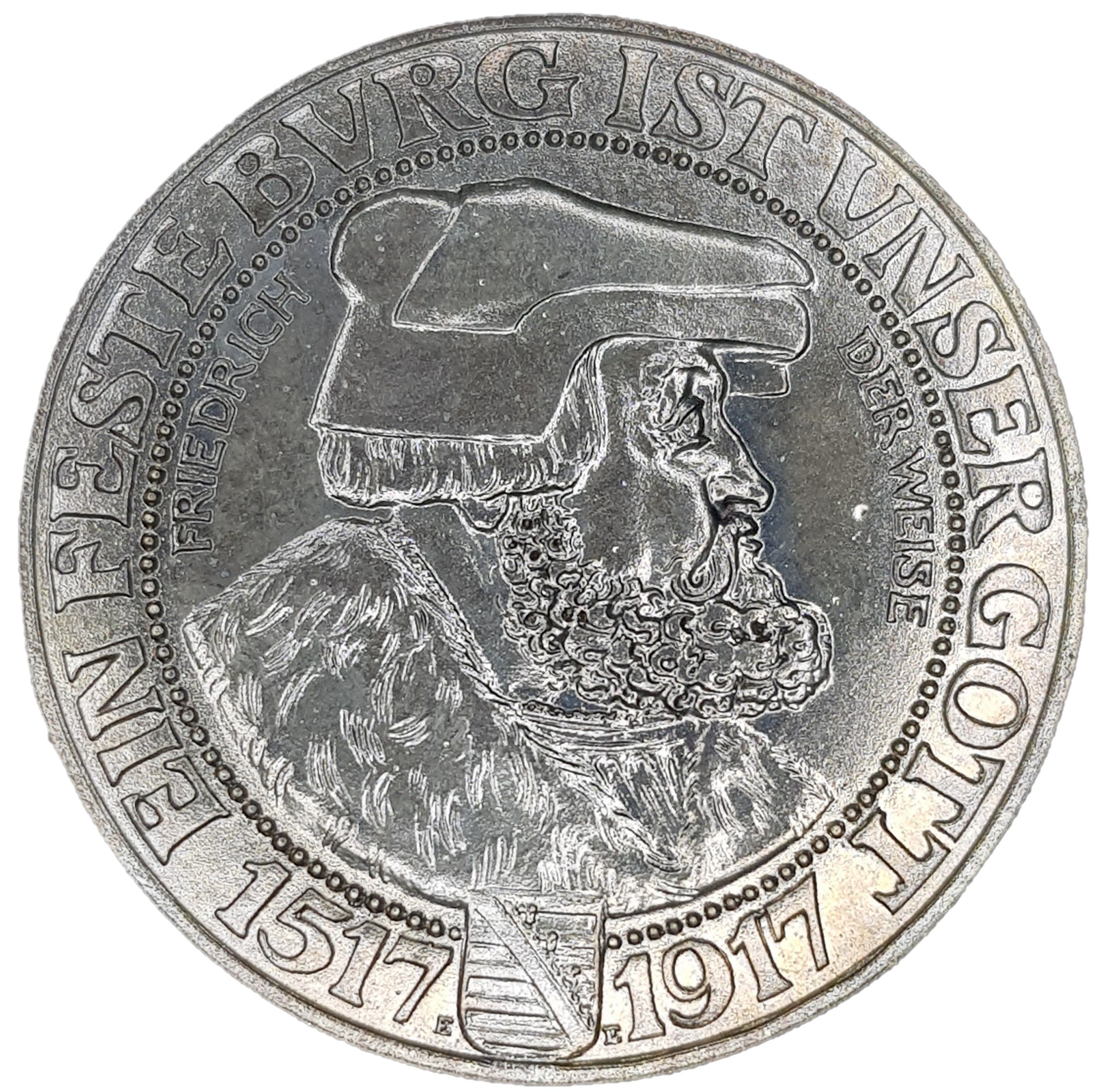 Опис: (Оригінал — надзвичайно рідкісна монета, викарбувана в 1917 році) Погруддя Фрідріха Мудрого, звернене вправо (захисник Мартіна Лютера), легенда та дата