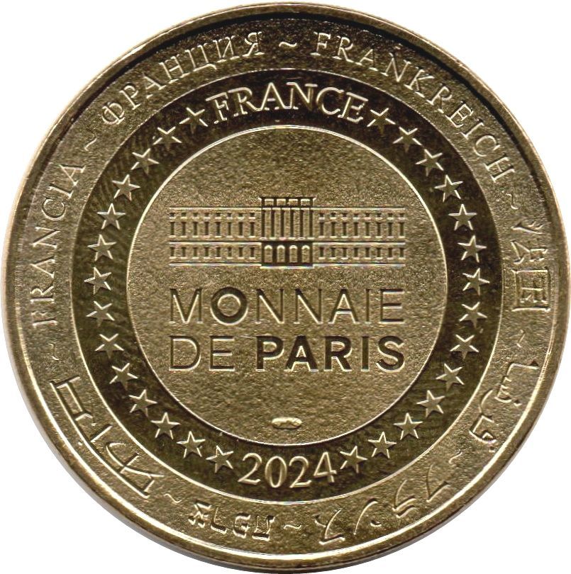 Опис: На периферії слово «Франція» написано вісьмома мовами. Франція на 12-й годині, 2024 рік на 6-й годині, все пов'язане 14 зірками праворуч і ліворуч. У центрі — будівля монетного двору в Парижі.