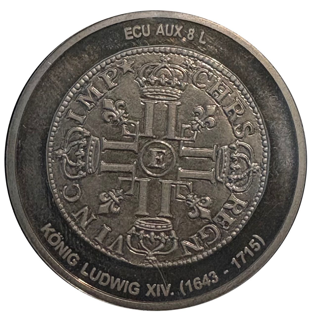 Опис: Дизайн, що імітує французьку монету Écu aux 8 L Людовика XIV з чотирма коронами та вісьмома літерами «L», що утворюють хрест, та лілією між гілками.