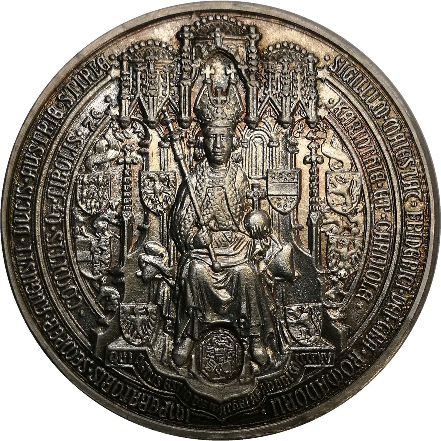 ·SIGILLUM·MAIESTAC·FRIDERICI·DEI·GRA·ROMANORU·IMPERATORIS·SEMPER·AUGUSTI·DUCIS·AUSTRIE·STIRLE· ·KARINTHIE·ET·CARNIOLE· ·COMITIS·Q3·TIROLIS·7c·