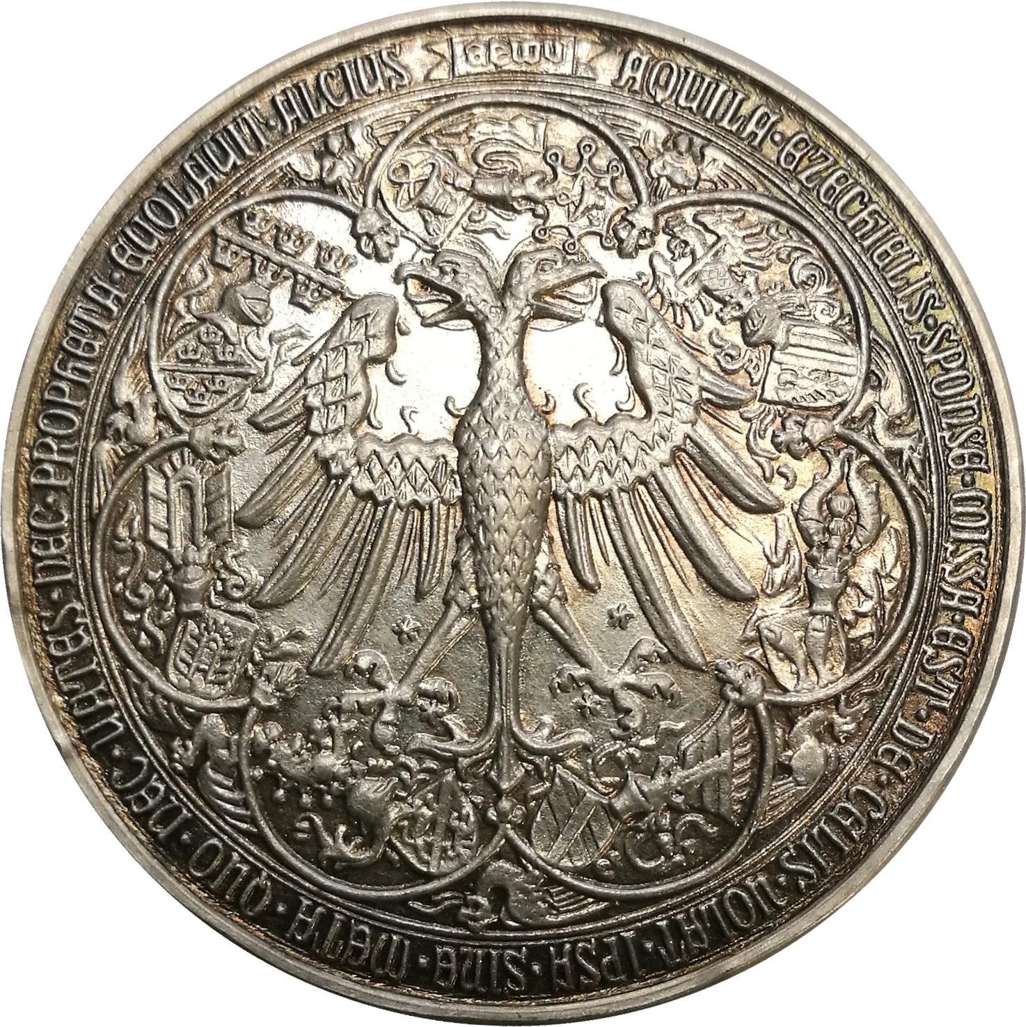Опис: Зображення печатки імператора Фрідріха III Габсбурга. У центрі зображено двоголового орла, навколо нього дугою розташовано сім гербів з шоломами. Перший герб знаходиться над головами орла, а далі за годинниковою стрілкою, зліва направо, розташовані: 1) Віндішська марка 2) Ландграфство Ельзас (Ельзас)