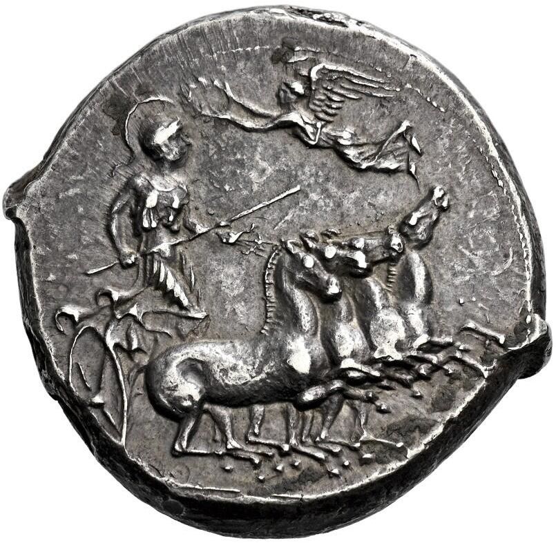 Опис: Швидка квадрига, керована Афіною в шоломі, яка тримає віжки та кентрон; над кіньми літає Ніка, яка летить ліворуч, щоб увінчати її. В екзергу — ячмінне зерно.