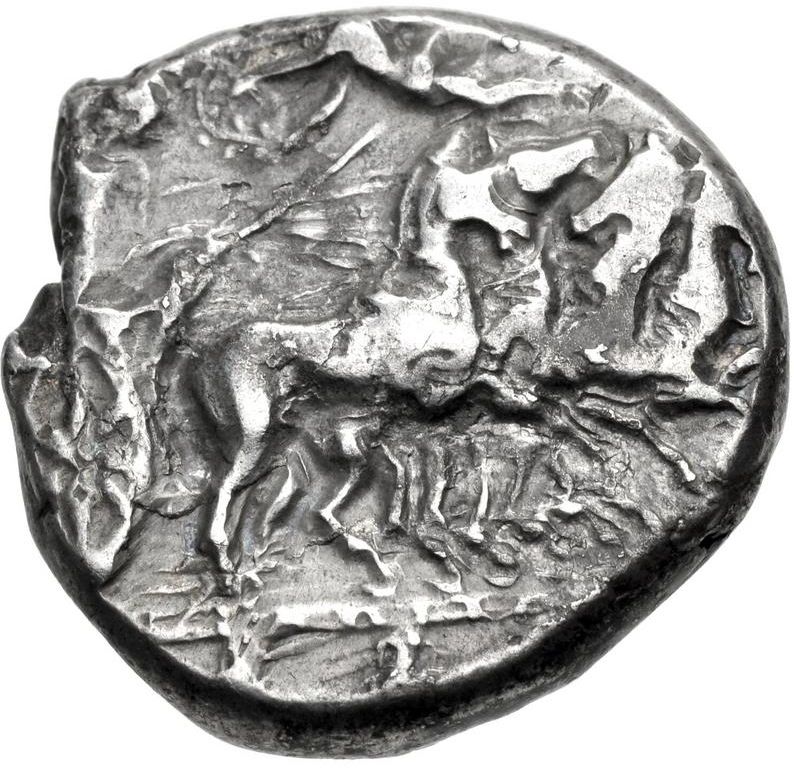 Опис: Афіна, одягнена в атичний шолом з гребенем і довгий хітон, тримає кентрон у правій руці та поводи в обох руках, керуючи квадригою, що мчить праворуч; зверху — Ніка, що летить ліворуч, готується увінчати Афіну вінком, який тримає в обох руках; ретроградне KAMAPINAIΩN на лінії екзергу, дві амфори в екзергу.