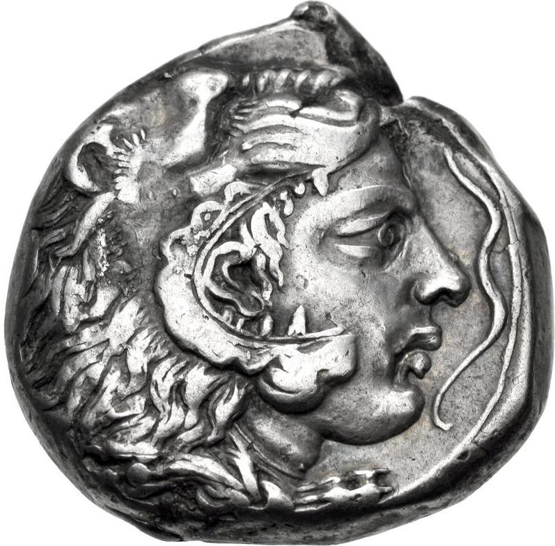 Опис: Безборода голова Геракла праворуч, в головному уборі з левової шкіри, зав'язаному на шиї; лук праворуч.