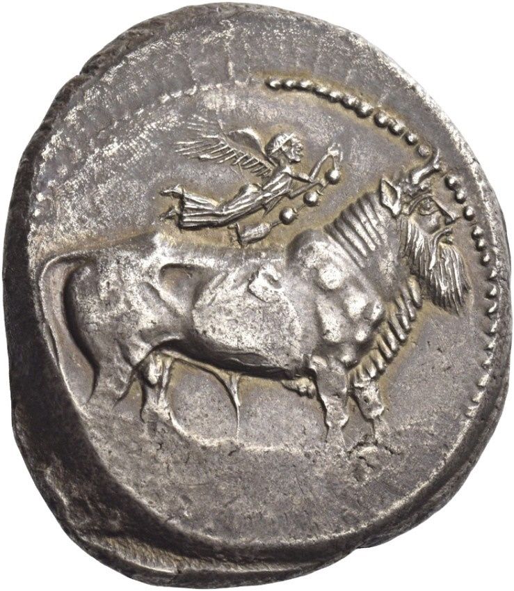 Опис: Річковий бог Аменанос у вигляді бородатого бика з головою людини, що стоїть праворуч; зверху — Ніка, що летить праворуч і тримає таенію.
