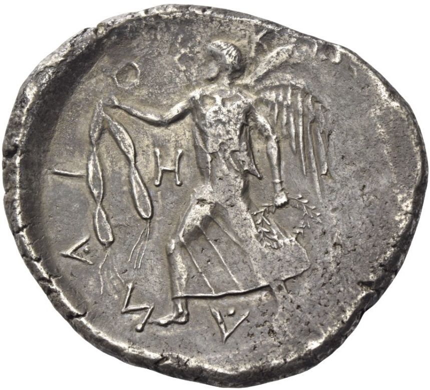 Опис: Ніка, одягнена в довгий хітон, крокує вліво, тримаючи вінок у лівій руці та таенію у витягнутій правій. У внутрішньому лівому полі — H.
