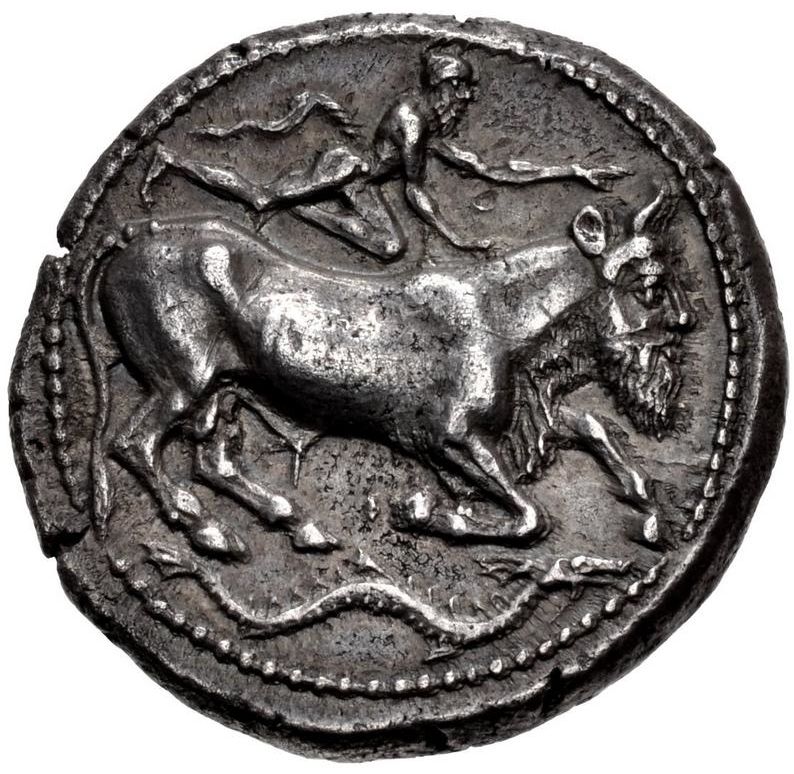 Опис: Річковий бог Аменанос у вигляді бика з головою людини, що стоїть на колінах праворуч; зверху — сатир, що біжить праворуч, з витягнутими і піднятими руками; в екзергу — кетос праворуч.