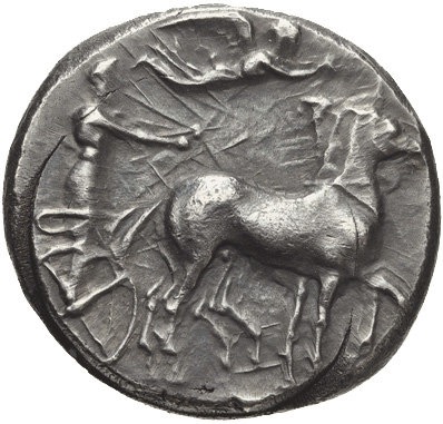 Опис: Водій колісниці, що їде праворуч, тримає кентрон у правій руці, а поводи в обох. Зверху — Ніка, що летить праворуч, вінчає коней лавровим вінком, який тримає обома руками.