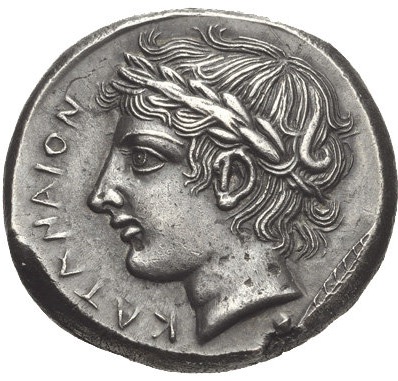 Опис: Голова Аполлона в лавровому вінку ліворуч. ΚΑΤΑΝΑΙΟΝ спереду, оливкова гілка праворуч внизу.