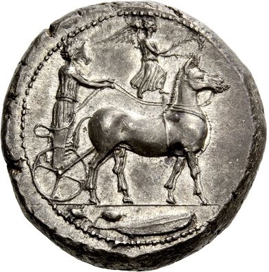 Опис: Німфа Мессана, одягнена в довгий хітон і тримаючи поводи в обох руках, керує бігою з мулами, що йдуть праворуч. Зверху Ніка летить праворуч, щоб увінчати мулів, а в екзергу — оливкове листя і дві ягоди.