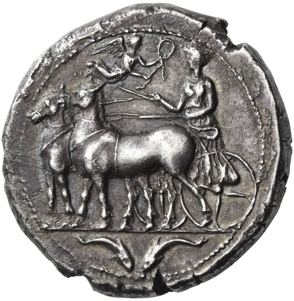 Опис: Німфа Мессана, одягнена в хітон, стоїть ліворуч і тримає в правій руці батіг, а в обох руках — поводи, керуючи бігою з мулами, що йдуть ліворуч; зверху — Ніка, що летить праворуч, щоб увінчати Мессану; в екзергу — два протилежні дельфіни.