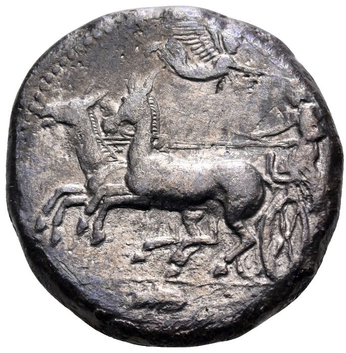 Опис: Водій колісниці, що їде на галопі на бізі з мулами ліворуч, тримає кентрон у правій руці та віжки в лівій; зверху Ніка летить праворуч, коронуючи водія колісниці; в екзергу — колос ліворуч.