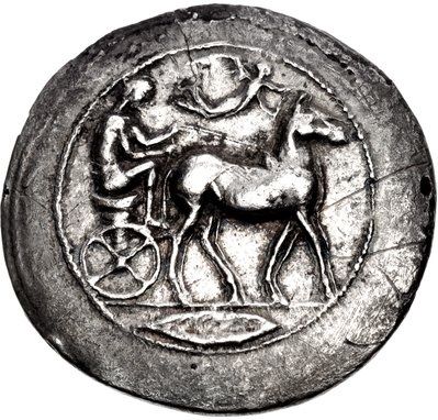 Опис: Німфа Мессана, тримаючи поводи в обох руках, веде повільну бігу з мулами праворуч; зверху — Ніка, що летить праворуч, увінчує мулів вінком, який тримає в обох руках; лист в екзергу.
